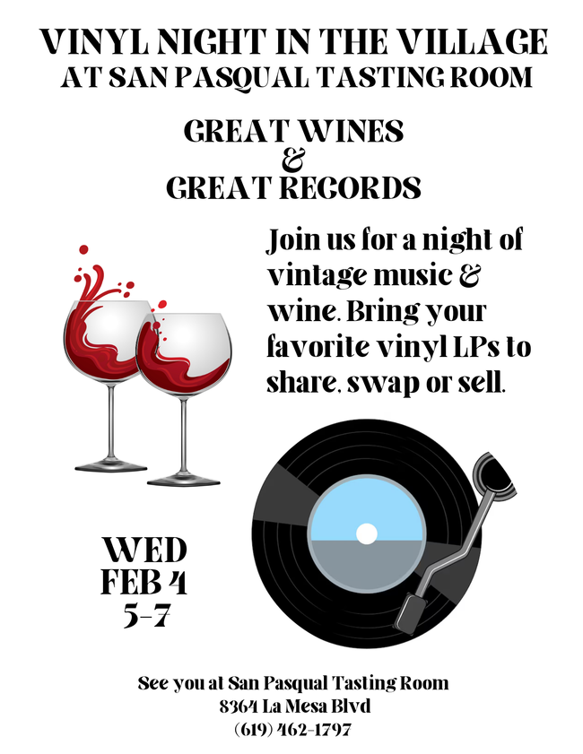 Drop the needle, sip your favorite wine, and vibe to classic records. Vinyl Night returns to our downtown La Mesa Tasting Room! Bring your own vinyl LPs to share, swap, or sell.